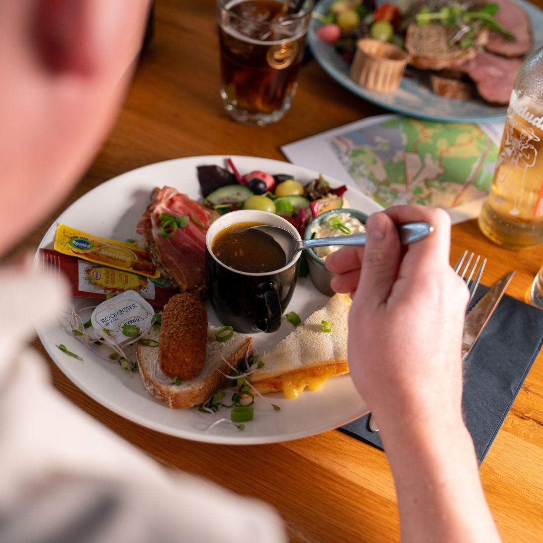 Na afloop schuif je weer aan bij ’t Hert va Woabich voor een smakelijke lunch. Je kiest zelf waar je zin in hebt: het uitgebreide Hertenuurtje met verschillende hartige gerechtjes, of een van de lunchgerechten zoals een broodje brie met warme groentesalade, een broodje warme beenham of een pasteitje met kippenragout.
