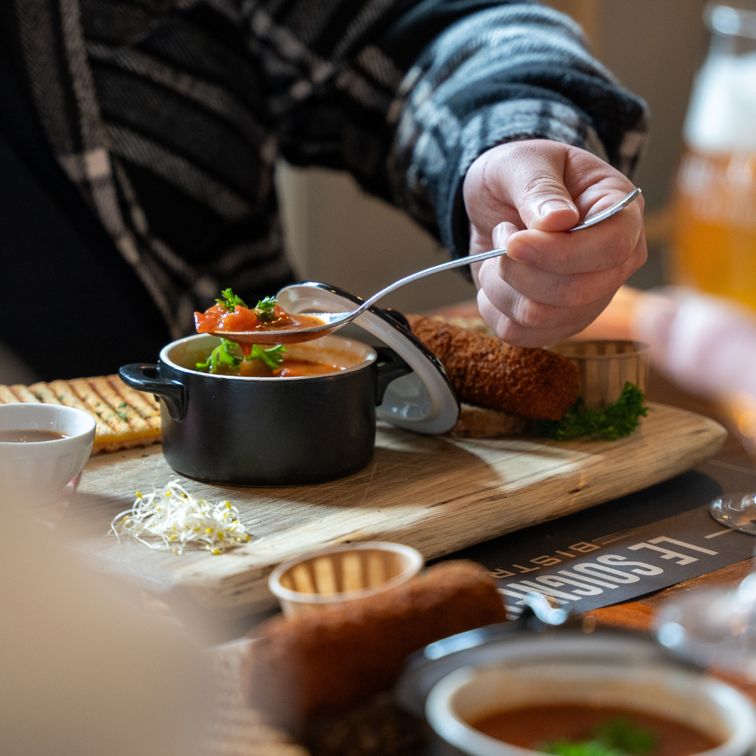 Bij terugkomst word je wederom verwend en geniet je van een welverdiende lunchplank bestaande uit een heerlijke soep, een mega-tosti én een kroket op vers gebakken molenaarsbrood.