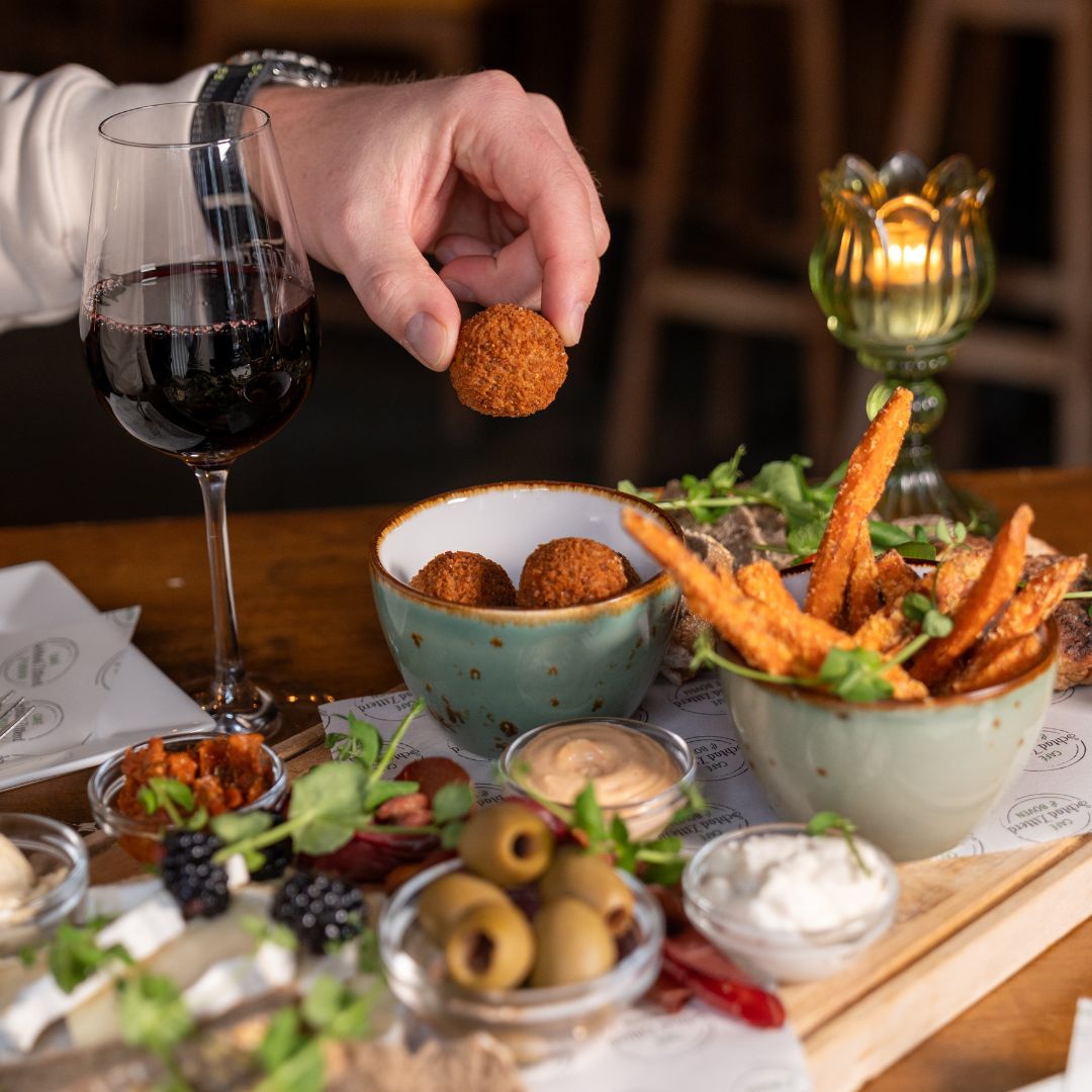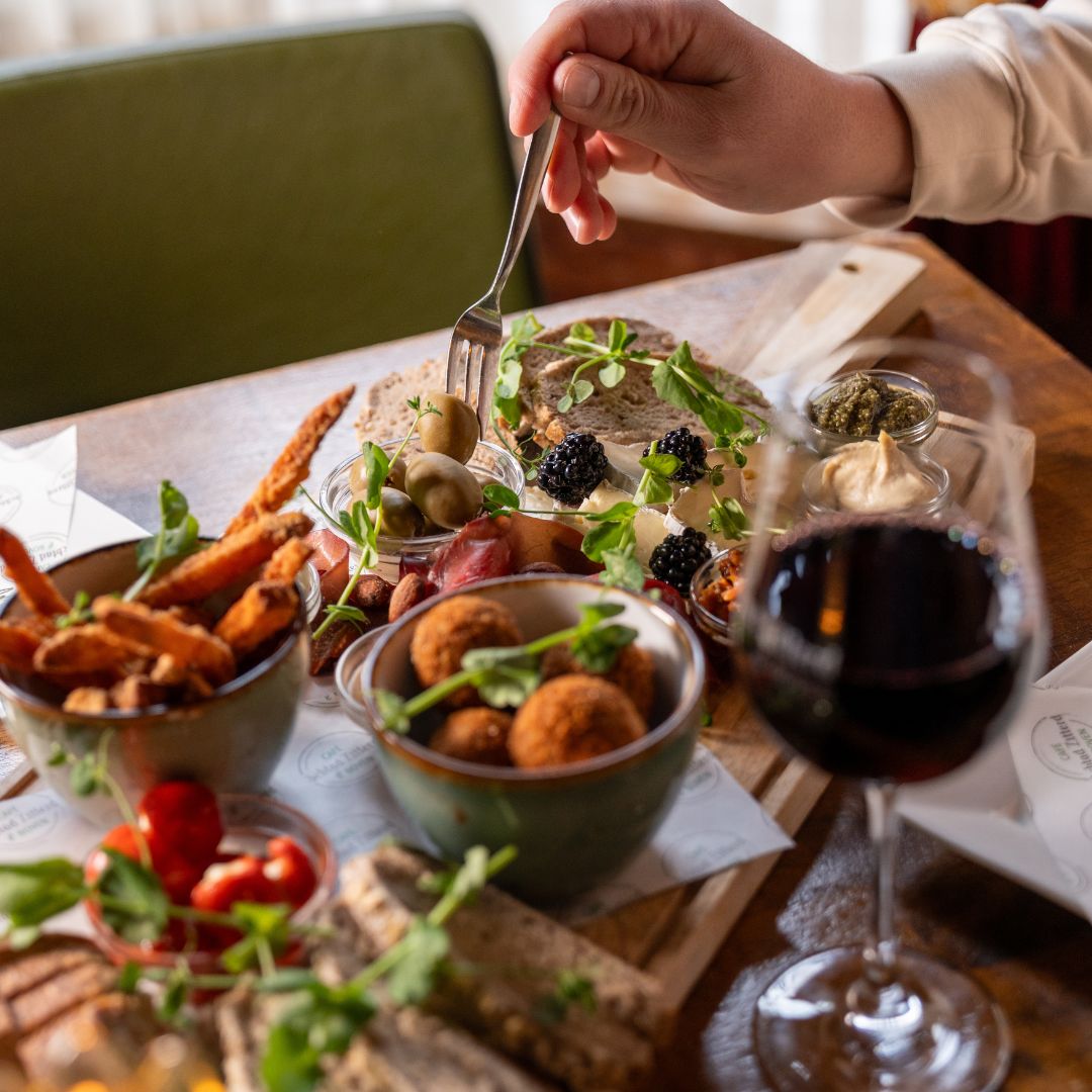 De borrelplank wisselt regelmatig en bevat een combinatie van warme en koude hapjes. Denk aan gemarineerde olijven, knapperig brood met smeuïge dips, patatas bravas, bitterballen, Italiaanse vleeswaren of lauwwarme camembert. Een variatie aan kleine gerechtjes, zorgvuldig geselecteerd om samen te delen en te proeven.