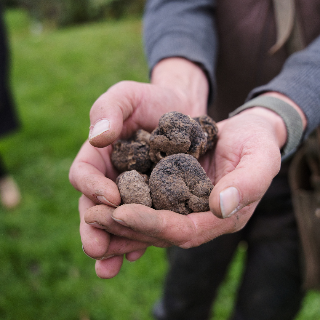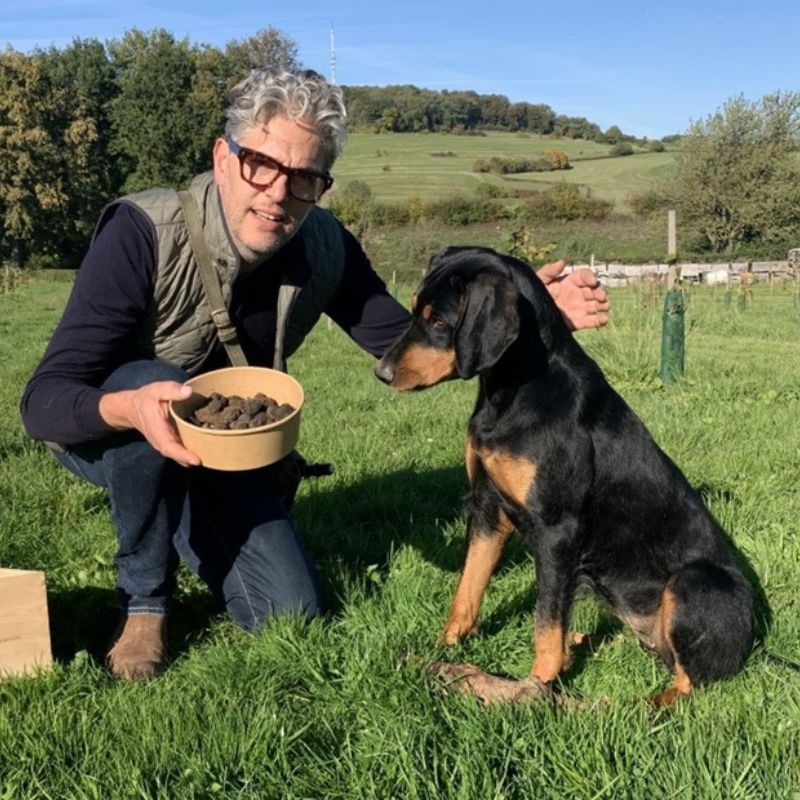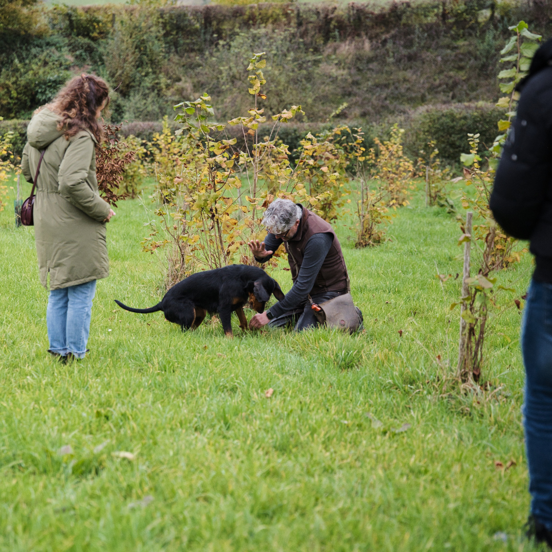 - Vervolgens volgt de rondleiding & mini masterclass truffels zoeken in de truffelgaard met truffelhond Gaya.