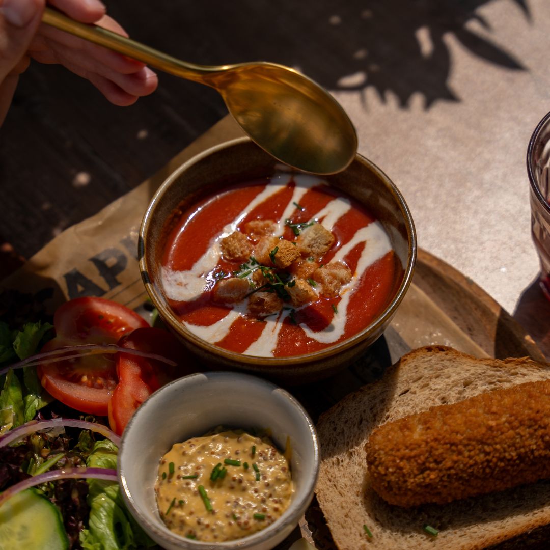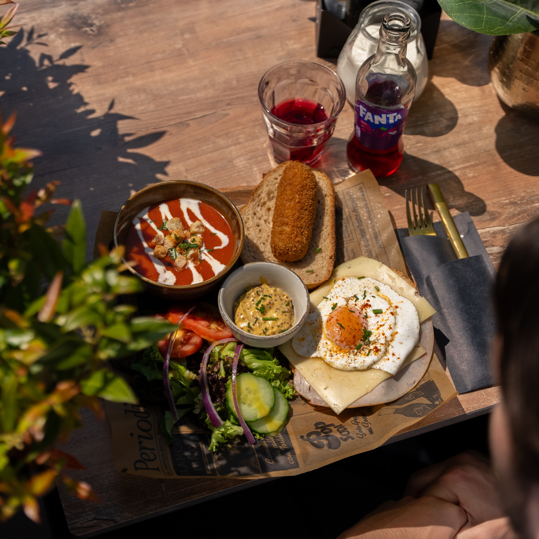 - Voor óf na de wandeling ontvang je een 12-uurtje. Deze lunchplank bestaat uit een soepje van het seizoen, brood met een kroket (kan ook vega) en een uitsmijtertje (of brood gezond), inclusief koffie, cappuccino, thee of een frisdrank.