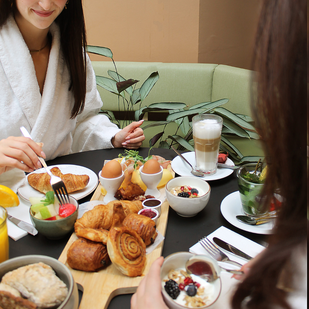 Een perfecte dag start je namelijk met een goed ontbijt. In je badjas schuif je aan tafel voor een heerlijk ontbijt. Kies voor een gezonde start van de dag met fruit, vers brood en yoghurt of ga voor een heerlijk verwenontbijtje met croissants, chocoladebroodjes, Limburgse vlaai of spek en eieren. Alles kan! Het ontbijt is compleet met d’orange koffie, cappuccino of thee. Daarbij krijg je een feestelijk glas Cava (of alcoholvrij alternatief) om het ontbijt nog luxer te maken! Dé perfect manier om je ochtend te starten.