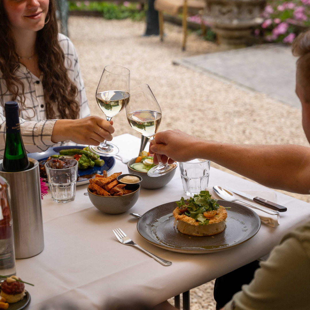 Je neemt plaats op een van de mooiste terrassen van Limburg met schitterend uitzicht over de Maas en ontvangt een mousserende wijn én een amuse.